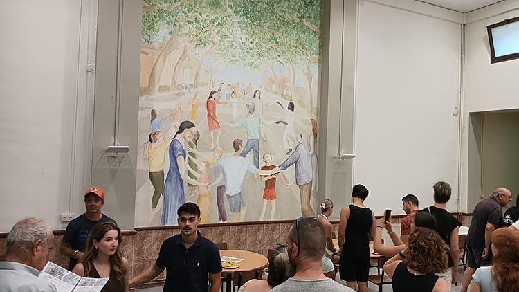L’interior d’aquest cafè llueix el mural pintat per Amara Nasira i José Manuel Pérez, que formen el tàndem artístic elpequeñogrande i realitzen projectes al servei de causes comunitàries, com aquest grafit que representa el municipi de Sant Climent a través d’una celebració, d’una festa en què els braços de les persones s’entrellacen amb les branques dels arbres del poble.