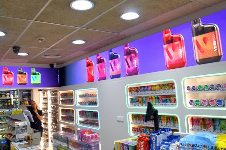 El nostre establiment té grans pantalles amb publicitat dinàmica, que va canviant per mostrar la diversitat del nostre estoc i com s’ha de preparar una bona shisha. Es tracta de bandes lluminoses com les que hi ha en els camps de futbol. De fet, els operaris que les van instal·lar són els mateixos que les van col·locar en l’estadi Bernabeu.